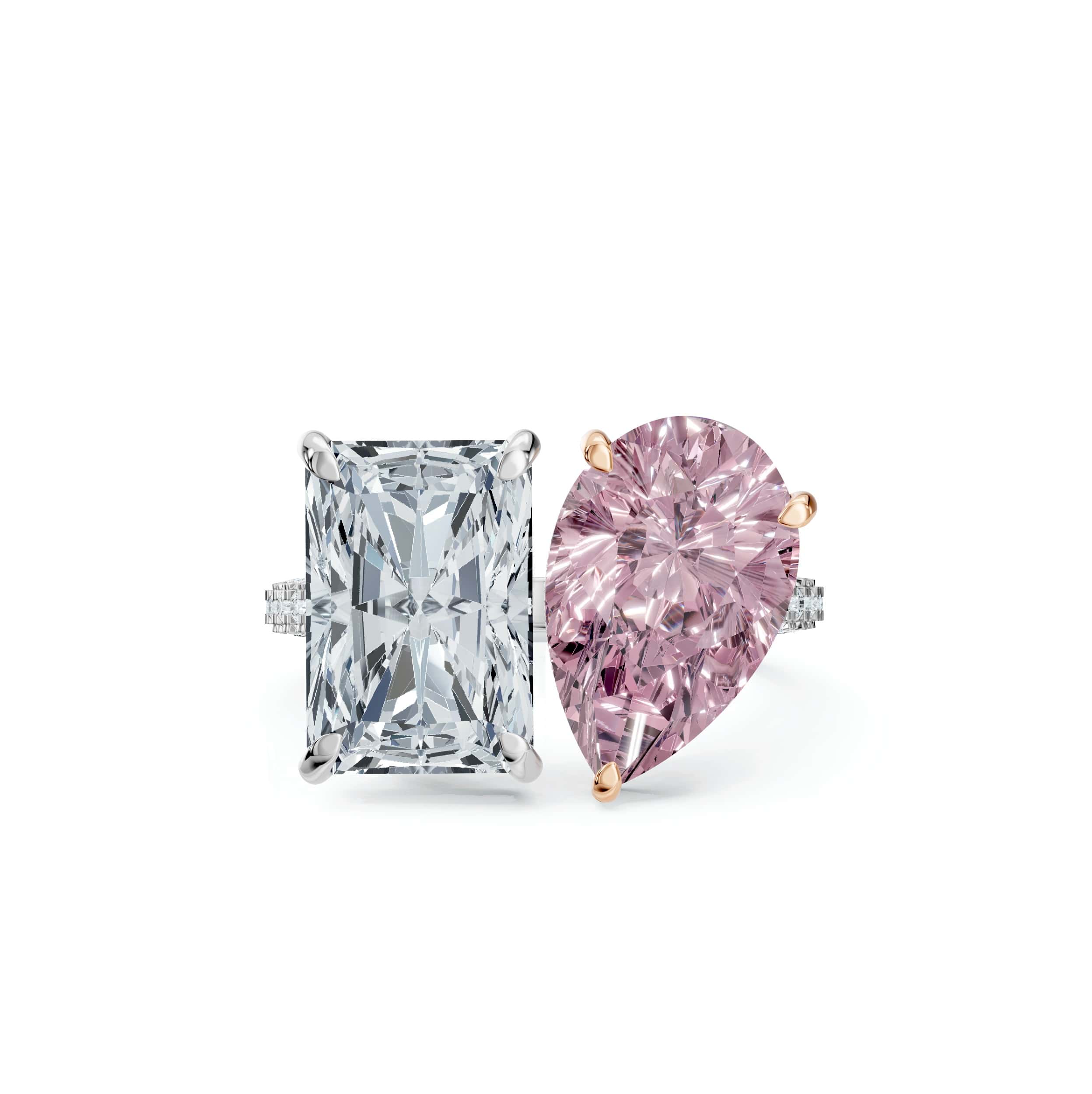 A Radiant-cut centre diamond paired with a Pink Pear-cut stone set on the signature Rose micro-pavé semi-eternity band, united in a Toi & Moi silhouette celebrating contrast, colour, and modern romance.